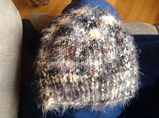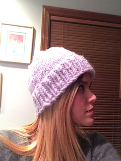 This is a very basic beanie in super bulky yarn. The needles are small to create a dense fabric. The hat is very warm and has a modern fit.