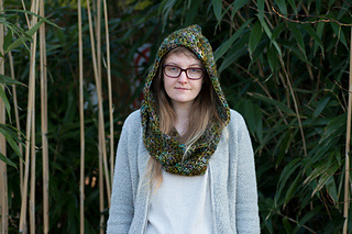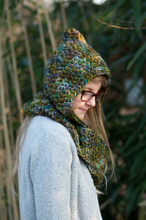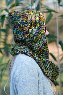 This pattern creates a beautiful hood with a circle/infinity scarf attached to it, which wraps around a couple of times. It works up incredibly quickly with your super bulky weight yarn and it extremely warm and snuggly.