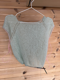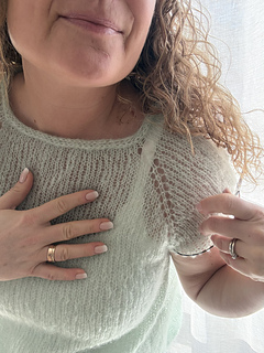 Passformen er litt oversized, men samtidig feminin i snittet. Raglanøkningene lages ved hjelp av kast, som danner små hullrader på hver side av raglanmaskene. Dette gir blusen et lett og delikat uttrykk.