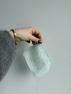 Dobbel tynn tråd silk mohair. Eller en tynn følgetråd som f.eks Alva fra Filcolana sammen med en tynn silk mohair.