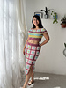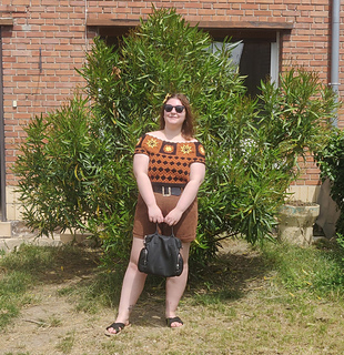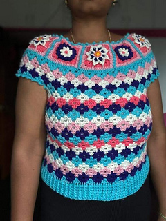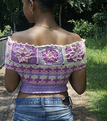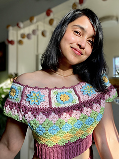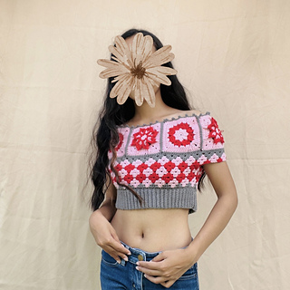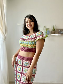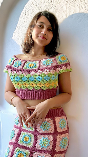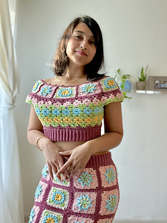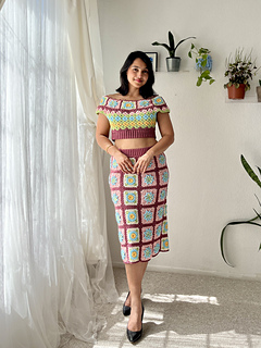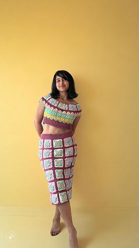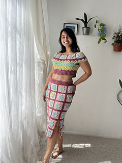 The SuperBloom Set is made up of an off-shoulder top and a pencil skirt using two designs of Granny Squares, Granny stitches and basic single crochet ribbing.