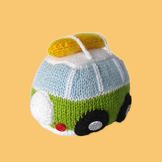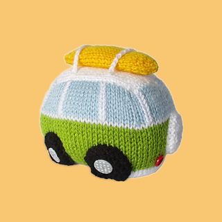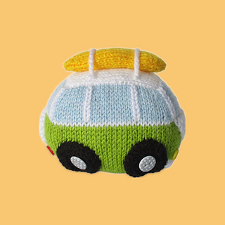 For retro fans and surfers this chubby little Camper Van is sure to delight. Designed by Amanda Berry @fluffandfuzz, the camper van and surfboard are knitted in acrylic DK yarns on single pointed needles (not in the round). There is no tricky colour-work to master here, if you can change colour at the end of a row to knit stripes then you can make a camper. The camper van pieces are knitted in stockinette stitch and sewn together, and the white window struts are embroidered after knitting in duplicate stitch.