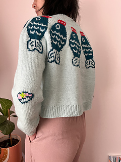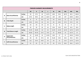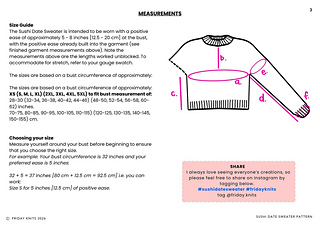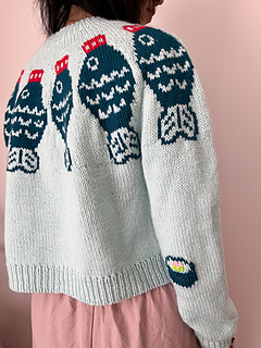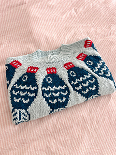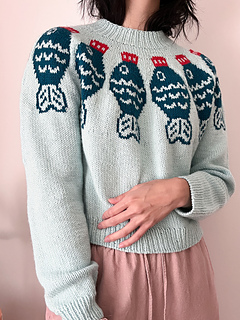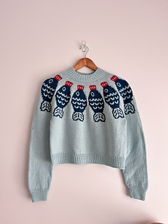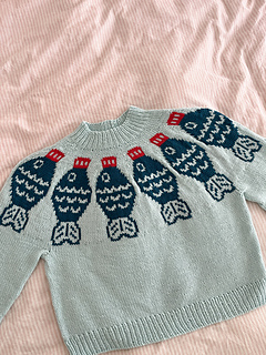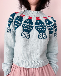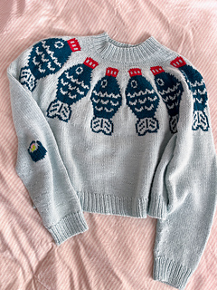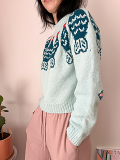 The Sushi Date Sweater Pattern is worked top down and in the round. Begin at the neckline in 1x1 rib, then work through the yoke following the colourwork chart. Once the yoke is complete, the sleeve stitches are placed on hold and the body is worked in the round from the underarms down to the hem. Each sleeve is then picked up and worked one at a time in the round. If desired, a decorative motif can be added to the elbows using duplicate stitch once the knitting is complete.