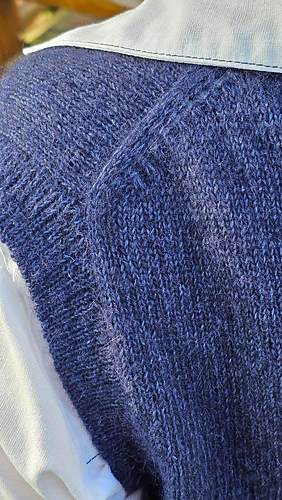 It is worked top-down. First the backpiece is worked flat and shaped with increases. Then the stitches are picked up at the shoulders to work and form the front sides. At the underarms, fronts and back are joined, and the body is worked flat on a circular needle. The armholes finishing and the button band are worked last.