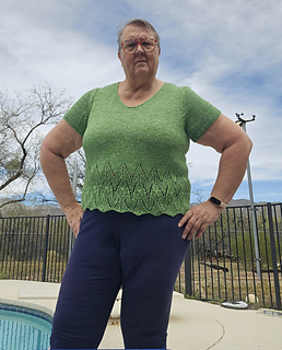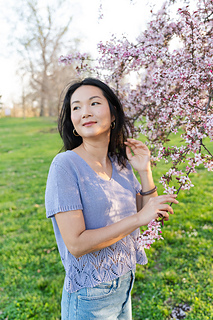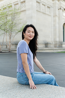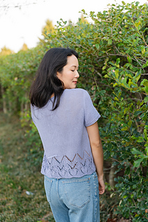 The short sleeve sample was knit using Knitting For Olive Cotton Merino (275 yards / 250 meters / 50 g / 1.76 oz / 70% organic OCS certified cotton+ 30% RWS certified extra fine merino / non-superwash) in the colorway Blueberry Ice Cream.