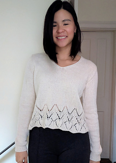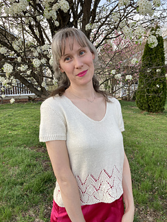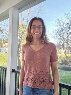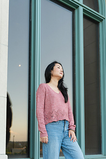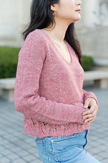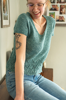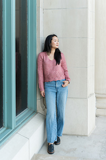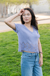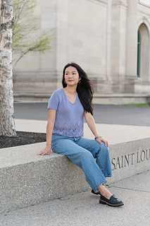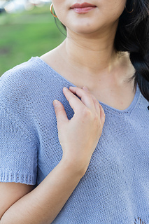 The Swallowtail V-neck is a set-in sleeve tee, featuring a fluttery hem paired with an understated, tailored upper torso. Worked bottom up, in the round, and then split front and back. Sleeves are worked separately in the round, then shoulders are seamed and sleeves inserted with mattress stitch.