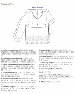 Sizes A (B, C, D) (E, F, G) (H, I, J) to fit upper bust measurements of 31 (34.25, 37.5, 40.75) (44, 47.25, 50.5) (53.75, 57, 60.25)” / 78.5 (87, 95.5, 103.5) (112, 120, 128.5) (136.5, 145, 153) cm.