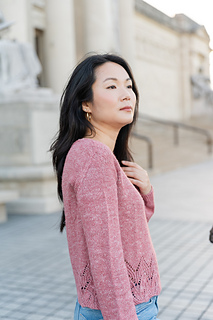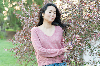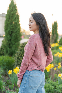 The long sleeve sample was knit with Aimee Sher Makes’ Comfort Silk Linen (400 yards / 365 meters / 3.5 oz / 100 g, 50% Merino + 25% Mulberry Silk + 25% Linen / non-superwash) in the colorway Rose Macaron.