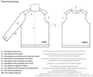 This sweater does not provide much ease of fit, the recommended positive ease for this sweater is from 4 to 12 cm (1.5” … 4.5”) depending on the size and man’s figure. The pattern is presented in seven sizes; it can be used for knitting on a man’s figure with a chest circumference of 76 to 125 cm 30″…49″. See the size range, technical data of the pullover, the algorithm of work with the pattern in the gallery.