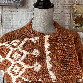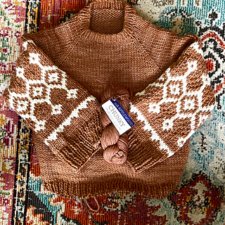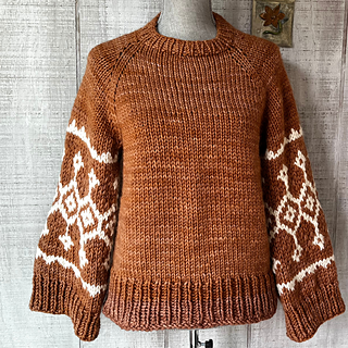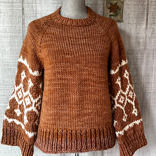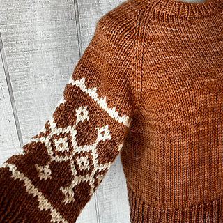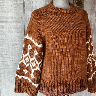 The sweater is knit in the round from the top down, starting at the ribbed neck opening. German short rows and raglan increases are created until you reach the placement of the sleeves which are placed on hold while the body is worked down to the bottom rib. Each sleeve is then picked up and knit in the round with stranded, charted colorwork, and oversized ribbed cuffs.