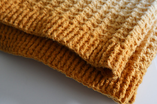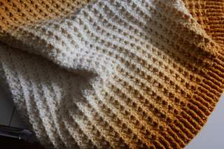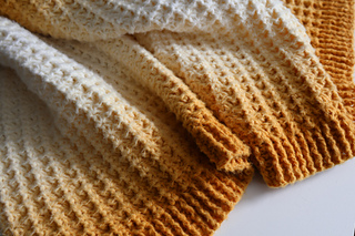 The Sweet as Honey blanket crochet pattern is simply worked along the short edges. It starts with a textured double crochet ribbing, the body is a solid shell stitch texture and then you will finish off the blanket with some more ribbing. It is worked all as one piece but as the yarn is on the lighter side, it’s not too burdensome to work under.