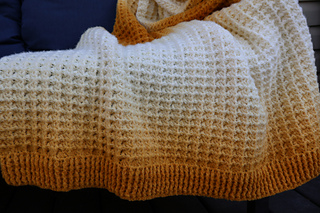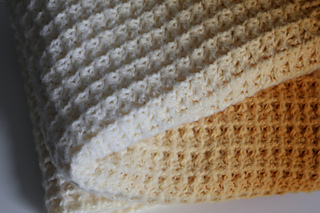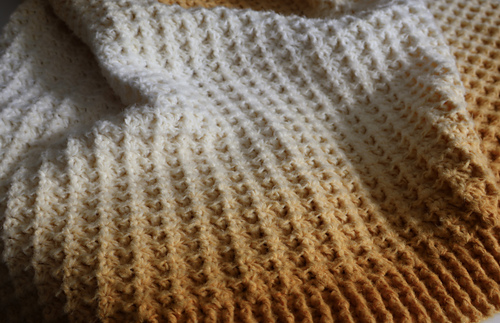 Yarn: Caron Cloud Cakes Perfect Phasing ® by Yarnspirations ® (100% Polyester; 227 g/8 oz; Approx. 720 yds/658 meters). Medium (4). Colour Shown: Golden. You will need 4 cakes.