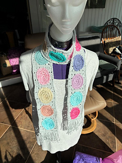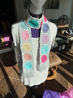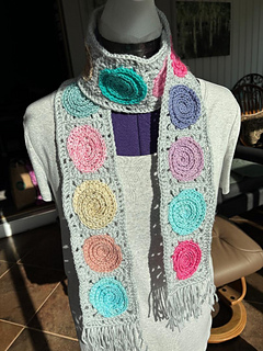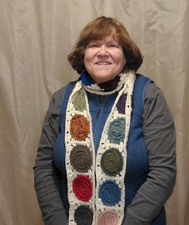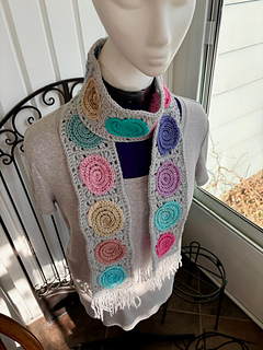 Tempted and have lots of scrap yarn? This scarf is a great project to use up small amounts of yarn. The center motifs are worked in a spiral. A border is worked around it to square it up and then the blocks are joined to make a scarf the desired length. Add a border and fringe to finish. The sample scarf was made with 18 spiral blocks. Finished it measured 65” long x 4.5” wide excluding fringe. It was made with 198 yards of worsted weight scrap yarn (11 yards per spiral) and 150 yards of another color yarn to border and finish the scarf using a size G/4mm crochet hook. You can use any weight of yarn by changing the hook size to suit the yarn. The 5 page pattern has written row instructions and two crochet charts.