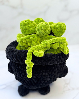 Beginner-friendly crochet cauldron pattern: sturdy chenille body, cute feet and handles, plus a drawstring liner.