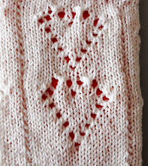 This is a very pretty sock with heart motifs done in lace. I have made a quirky chart. I am sorry I don’t have a program to create charts so I use a sort of spread sheet. I make it as simple and clear as I can and I explain the one complex stitch that is used. I used one skein of Stroll yarn for the sock and it hits me about mid-calf. I have big feet (size 9) so if you make a smaller one (shorter foot) you will need less yarn, of course. You could also make this a shorter cuff by only doing one repeat of the heart motif.