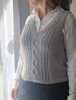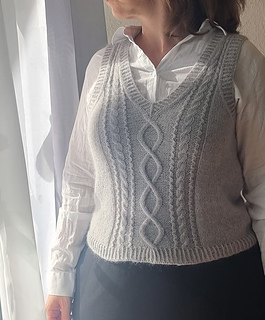 Der Sylva Slipover wird nahtlos von oben nach unten mit einer europäischen Schulter gestrickt. Zuerst wird das Rückenteil in Reihen gestrickt, die Schulternaht wird durch ein Zopfmuster verziert. Danach werden Maschen für die Schultern aufgenommen und nacheinander gestrickt, bis sie schließlich miteinander verbunden werden. Nachdem das Vorderteil mit dem Rückenteil verbunden wurde, wird der Slipover in Runden fertig gestrickt. Der Bündchenabschluss erfolgt mit einem verschränkten Rippenmuster. Danach werden Maschen an den Armausschnitten und dem Halsausschnitt neu aufgenommen und ebenfalls im verschränkten Rippenmuster gestrickt.