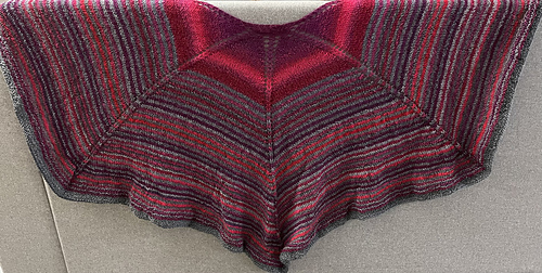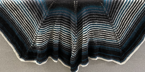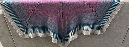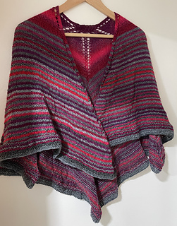 Syne is a striped shawl worked in four sections from the top down, perfect for self-striping or gradient yarns. The shape sits easily on the shoulders, allowing it to be worn open or closed with your favorite shawl pin.
