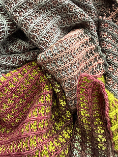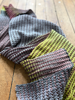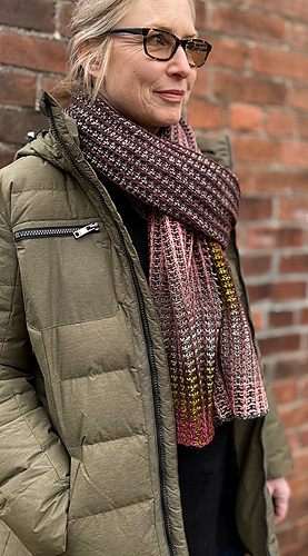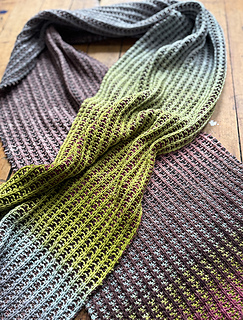 The pattern is worked with only knit and slip stitches, there are no purls, and yet you end up with a wonderful plump type of mock rib. It’s a joy to watch the color change on each face, and, after blocking, the reverse face really shows through on the other side, expanding the color dimensionality of the whole piece. In the end, you will have a luscious, long and extravagant scarf that is warm and cozy and yet lightweight, with beautiful drape.
