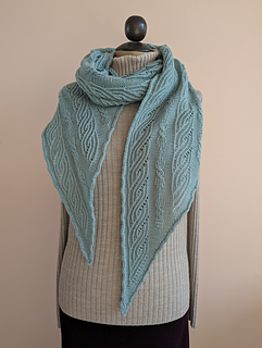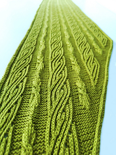 Tailor-Made Twist begins with a 3-stitch cast on and after the initial increases, 1 stitch is increased every RS row while pattern repeats are added until the full width is reached. The scarf is framed on either side by the twisted lace panels and can be adjusted in width by working additional repeats until you get the desired result and then decreased in the same manner.
