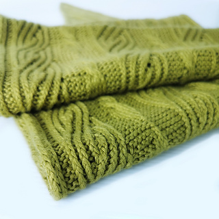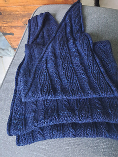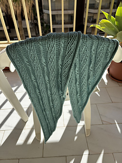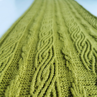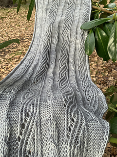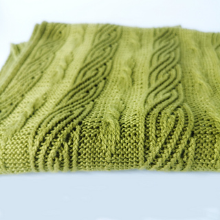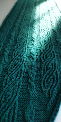 (3 pattern repeats after blocking: twisted lace/purl section/twisted cable/purl section/twisted lace)