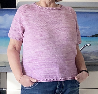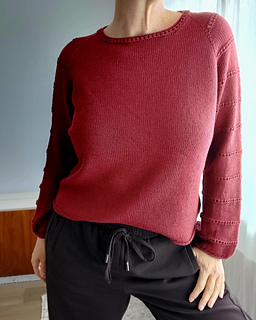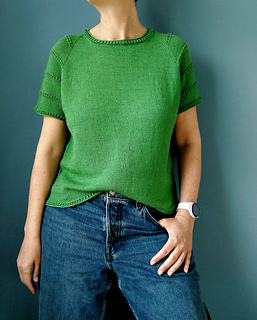 The design offers maximum flexibility: the pattern includes options for both short and long sleeves, allowing you to adapt the shirt to any season. A subtle, elegant eyelet pattern runs along the sleeves and is mirrored in the hem and neckline, giving the tee a sophisticated touch.