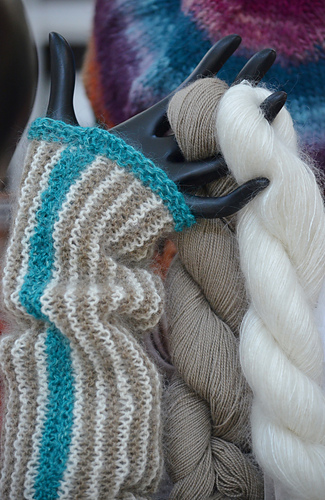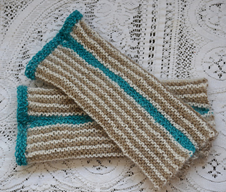 Here is a luxurious pair of feather-light wrist warmers or long cuffs to quickly knit for cool summer evenings or to add warmth on an autumn afternoon. Each piece is knit in a rectangle, in a simple two-color striped garter stitch without increases or decreases and is seamed to form a tube. A thin border in a contrasting color defines the clean geometric lines. Instructions are written for an average adult wrist circumference.