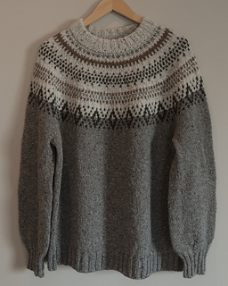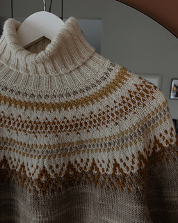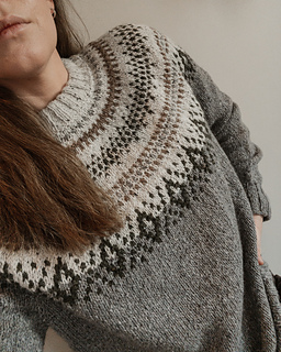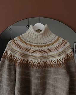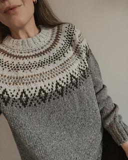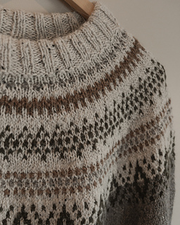 The sweater is worked from the top down, in a mosaic pattern that gives both depth and calm. You knit with only one strand at a time. The motif appears slowly – through small movements, knits and purls shaping a piece of pattern like a jewel.