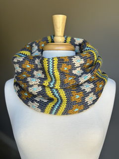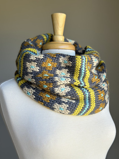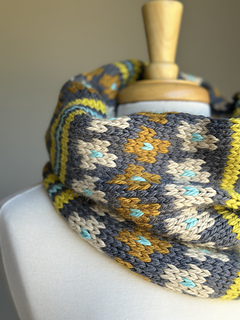 This richly textured color work cowl combines warm golden tones, cool aquas, and soft neutrals for a modern twist on traditional motifs. Tallulah is knit in one continuous tube and seamed at the finish. Its bold geometric pattern plays with contrast and rhythm, while the cozy double layer ensures warmth and comfort.