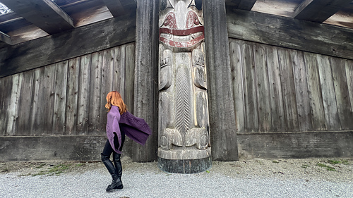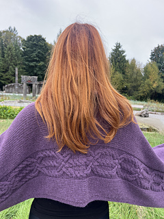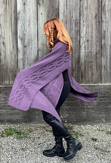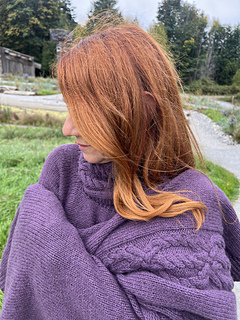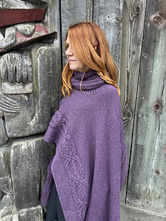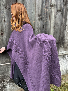 Tamiko – many beauties in Japanese - is a cape adorned with cables divided in two by a ribbed neckband. Knitted in one piece with shaping for the neck and tidy double knitted edges to make it hang straight. Wear it as you like; hanging loose across your shoulders as a cape or hanging down along your body as a poncho or thrown across one shoulder like a shawl. Make the matching cowl to wear like a collar. Tamiko is knitted in the gorgeous Baby Yak Medium from mYak.