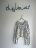 The light Tanya is knitted with single thread Kid silk mohair. The sweater is knitted with a color where the yarn is dyed up 50/50, this dye technique creates this beautiful pooling effect when knitting (irregular stripes). When you are knitting with the yarn dyed with that technique, the colors change from one to the other. Pick either one of the colors to highlight and choose a color in Wild alpaca to knit it with. Every 3/4th time your selected color comes up, add Wild alpaca with it and stop when the color dyes out. You simply rub the Kid silk and the Wild together with your fingers until they stick together. The rib for cuffs, hemline & neckline are all knitted with double thread of Kid silk lace.