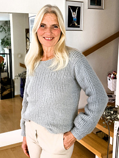 Aufgrund des Materials ergibt sich eine andere Maschenprobe als bei dem Chunky-Sweater TASSIMA und damit auch andere Reihenzahlen für Halsausschnitt und Ärmel. Man braucht für diesen Sweater nur ca. 250g für Gr. S.