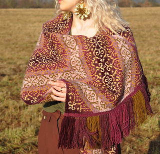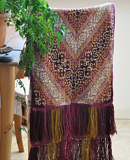 Verwendete Techniken: Rechts- und Linksmaschen, Umschlag, 2 Maschen zusammenstricken, Jacquardstricken mit zwei Farben gleichzeitig, feste Häkelmasche, Fransen anknüpfen mit einer Häkelnadel, Maschen über einem Rand herausstricken