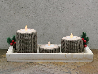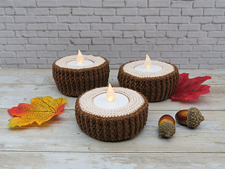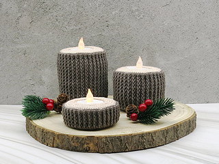 With 2.0 mm hook and Sport weight yarn (e.g. Catania Originals, Katia Capri, Catona) the tealight holders have a size of 8 cm in diameter and a minimum height of 2.5 cm.