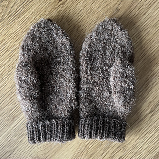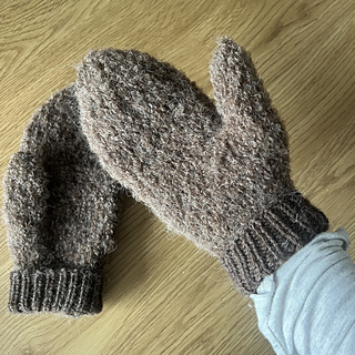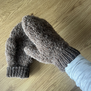 The mittens feature a classic cuff in 1×1 rib, followed by a smooth stockinette hand section that highlights the boucle’s texture. The thumb stitches are placed on hold and worked afterward, ensuring a simple, continuous construction with minimal finishing.