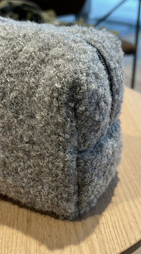The bag is worked flat in one piece and folded into shape. The sides and corners are sewn to create a structured base, and a zipper is attached at the top opening.