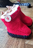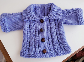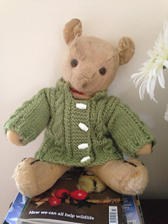 An easy aran pattern of cables and twist stitch worked over 6 rows. The jacket has set in sleeves and a garter stitch collar. The Ugg boots are worked in stocking stitch with a garter stitch border.