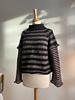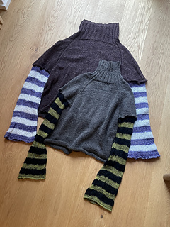 You may choose how many different yarn types you want to use for the sweater and the thickness of the stripes. The pattern describes the overall construction of the sweater, while the stripe design is left to your artistic freedom. Below are a few examples showing different yarn types and varying stripe widths.