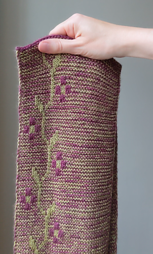 The Tendril Tapestry Scarf is a reversible design featuring a simple double-knit climbing flower motif set against a cozy garter stitch background.