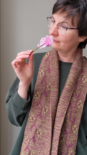 This pattern continues the Daisy Chain series, sharing a similar floral motif. However, unlike previous patterns in the series where the motif was worked along the garter ridges, the Tendril Tapestry Scarf motif grows perpendicular to the ridges and includes delicate leaf elements. This new direction creates a smoother, wavy line and a more realistic look for the stem, giving the fabric a new dynamic.