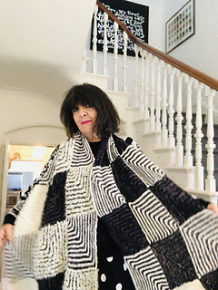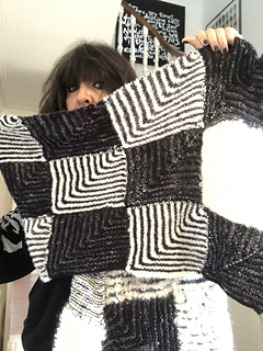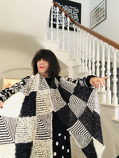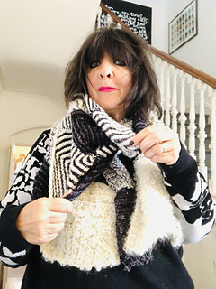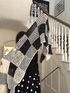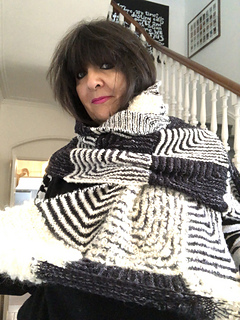 Work 3 mitred squares; add 3 more until you have created 30 squares/10 rows – or longer if desired. Any yarn can be used, the biggest contrast works best… you can of course go wild and use different textures, different yarn weights and colours.