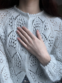 The Thalia Cardigan is an all over lace round neck raglan cardigan with slight balloon sleeves and delicate picot edge details along the hem, collar, and cuffs. This design features an elegant repeating lace motif providing an airy and light fabric, allowing the cardigan to be both breathable and warm. Due to the nature of the lace pattern, the body and sleeves of the cardigan are knit from the bottom up, jumping right into knitting lace. The sleeves and body are joined together and raglan shaping is worked to create structure to the yoke. A double knit button band is worked on either side of the body edge, and the picot edge hem and collar are worked last. The underarm seams are seamed closed and buttons are sewn to the button band to complete the cardigan.