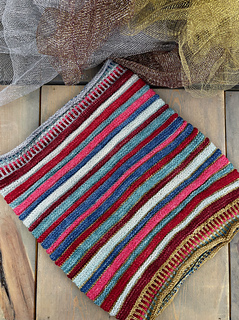 The 13th Cowl is inspired by the bold stripes and joyful energy of the Thirteenth Doctor’s scarf. Knit with eight fingering-weight mini skeins, it features high-contrast stripes in stockinette and reverse stockinette for texture and movement.