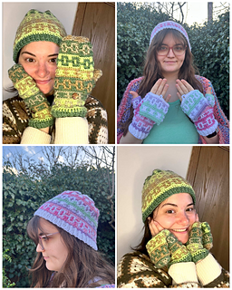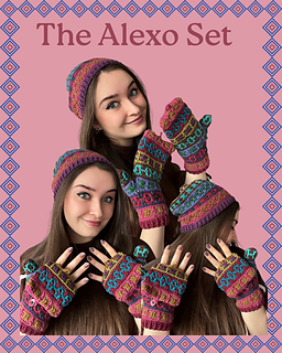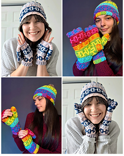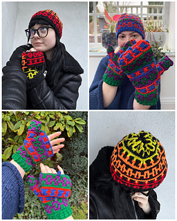 This set includes the pattern for a beanie, as well as adjustable mittens! You can use many colours or as little as two with the mosaic crochet method.