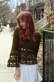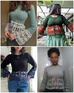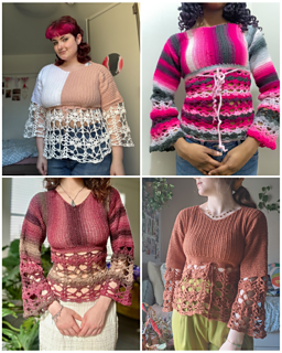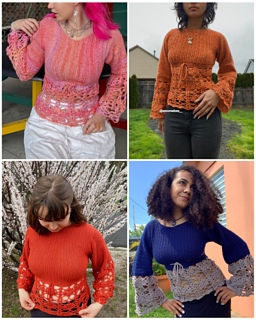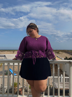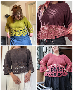 The Aurora Top is a 90s inspired, made to measure pattern that perfectly captures the essence of a witchy autumn. This pattern’s unique ribbed bust allows for a fitted yet opaque appearance, while the lace on the body and sleeves gives an extra flowy and airy addition, making it a perfect subverted basic. It works in front and back panels for the bust, and in the round for the subsequent lace and sleeves. This pattern is intermediate level, and includes a video aid link for the lace portion!