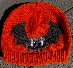 This child’s hat pattern utilizes knitting the hat in the round and duplicate stitching to add the Bat by following the graph.