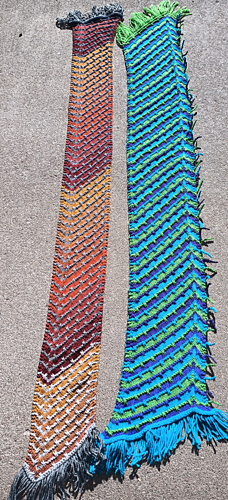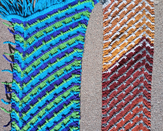 The Chevy Chase is a fun scarf pattern playing with working on a bias to create chevron shaped ends on the scarf. This is great for being thrifty and stash busting, you can use 2 left over skeins from a larger project or as many colors as you wish to create a project as unique as you. I was impressed how well the MC striping yarn worked up when paired with an ombre CC. The Wider scarf was made using 3 partial skeins, alternating every color change so all the colors got a chance to play both the MC and the CC. Pattern has an optional fringe you could attach on every odd CC row for added whimsy.