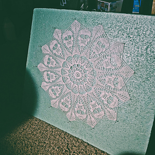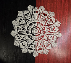 I was given the wild idea of a doily with 13 skulls. It was a large undertaking due to its odd count. But in the end, the fates guided me to create this Coven of skulls.