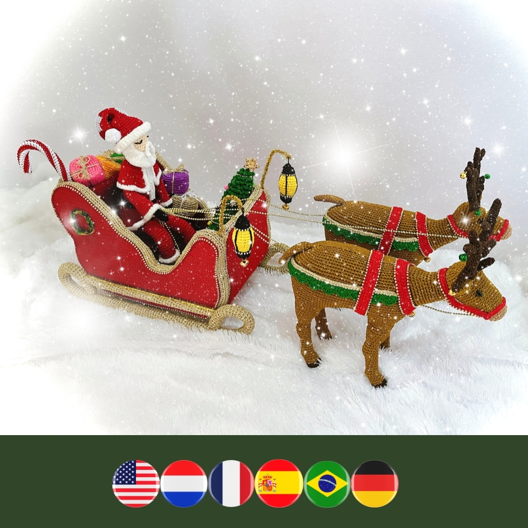 Le traîneau de Noël, les rennes et tout le reste sont réalisés avec un fil de poids “FINGERING” adapté à l’amigurumi et un crochet de taille 2mm.