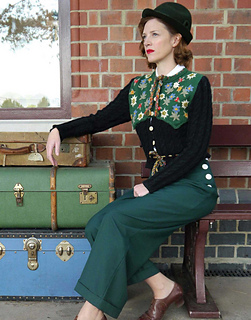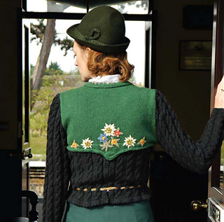 Edelweiss and gentians form the main part of the embroidered decoration on the yoke, worked in thick wool stitches and French knots for textured relief. The original flowers are all worked in edged chain stitch, but they can be worked in any preferred stitches. They have been recreated here with the original stitch for the edelweiss, but with variations on filled lazy daisy and stem stitch for the gentians and stylized flowers representing the little rhododendrons of the typical alpine trilogy.