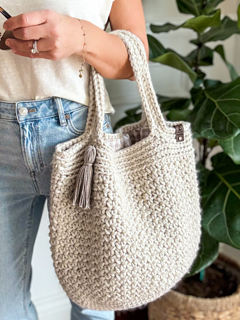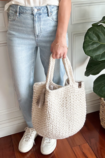 This tote is the perfect size for a trip to the beach, the market, or to use as a project bag. This medium-sized bag measures approximately 12” tall by 16.5” wide. The fabric liner gives the bag a more polished look while also making it more durable and preventing it from getting stretched out. The round bottom of the bag measures approximately 10” deep.